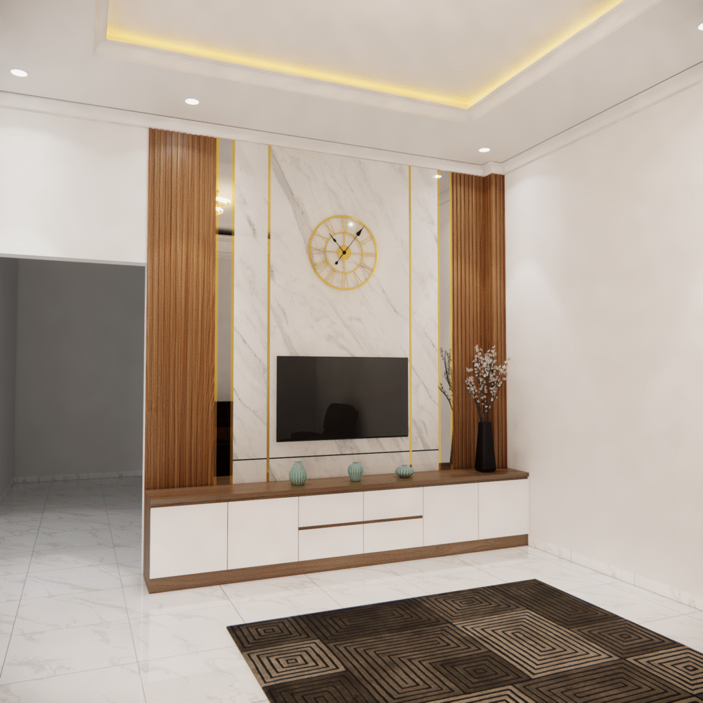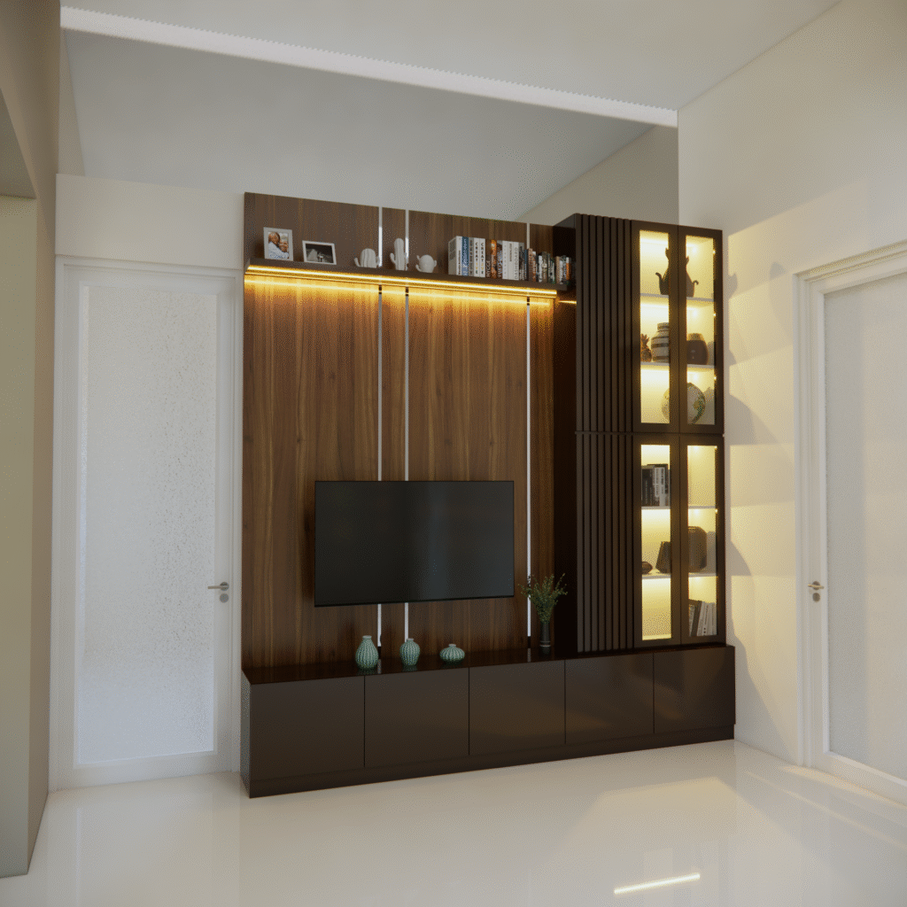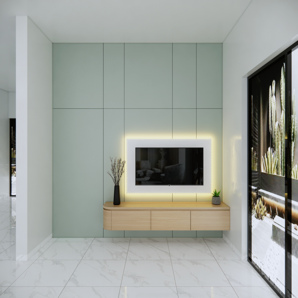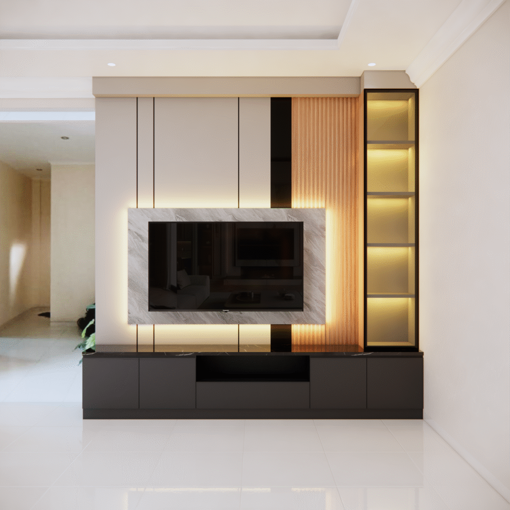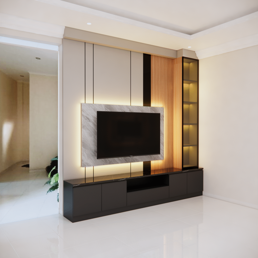backdrop tv juga dapat disesuaikan dengan konsep interior rumah, mulai dari gaya minimalis, modern klasik, hingga industrial. pemilihan warna tekstur dan aksen pada panelnya dapat dirancang agar senada dengabn furniture lainya, menciptakan alur desain yang menyatu. selain itu penempatanya yang presisi membantu mengoptimalkan ruang, terutama pada rumah dengan luas terbatas.