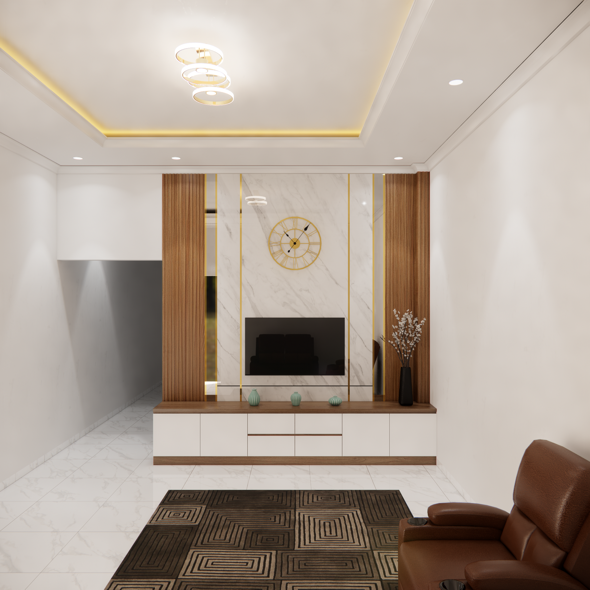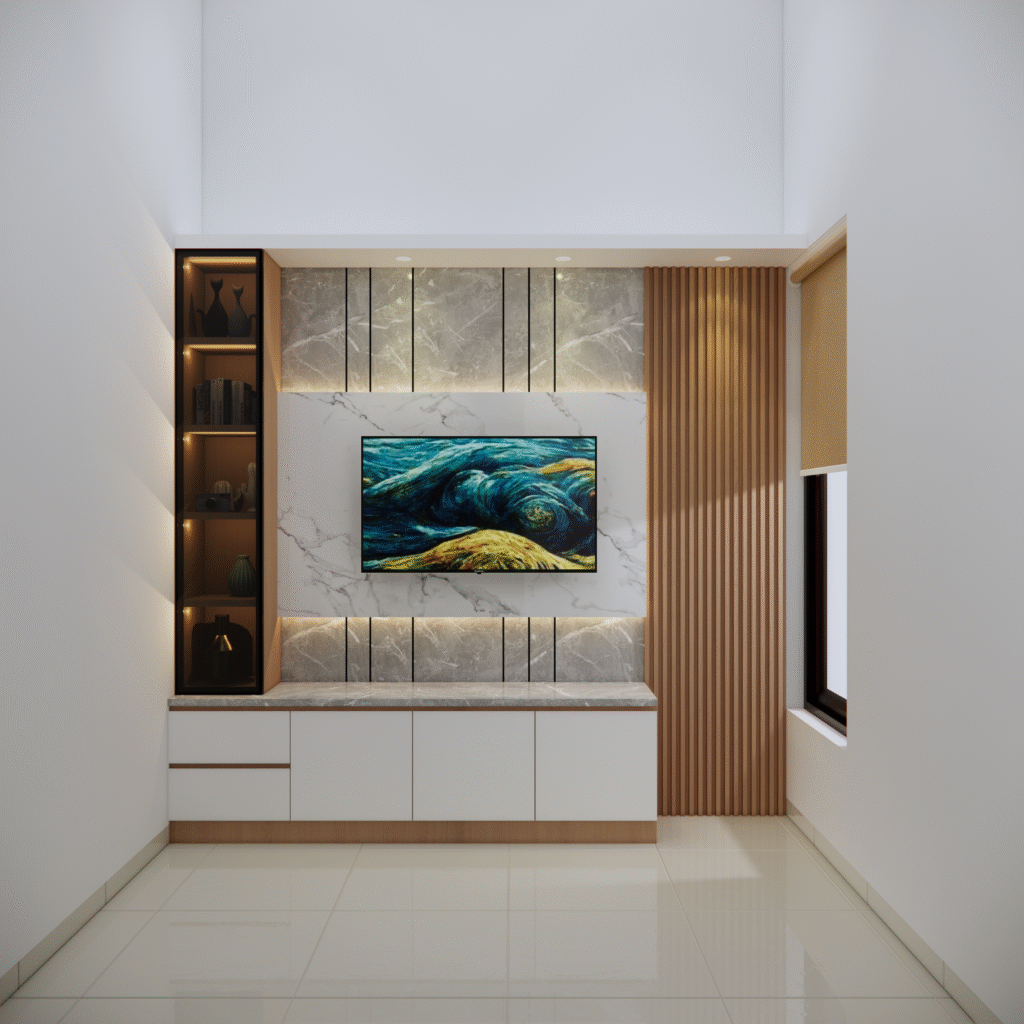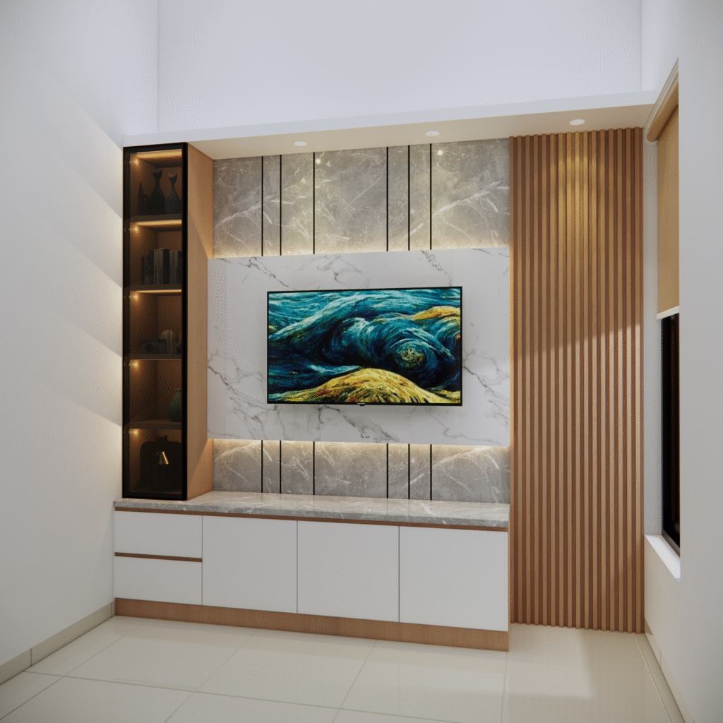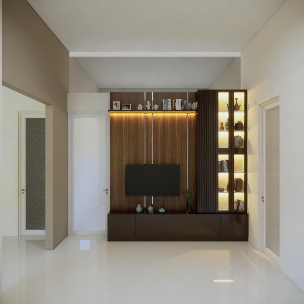 backdrop tv juga dapat disesuaikan dengan konsep interior rumah, mulai dari gaya minimalis, modern klasik, hingga industrial. pemilihan warna tekstur dan aksen pada panelnya dapat dirancang agar senada dengabn furniture lainya, menciptakan alur desain yang menyatu. selain itu penempatanya yang presisi membantu mengoptimalkan ruang, terutama pada rumah dengan luas terbatas.