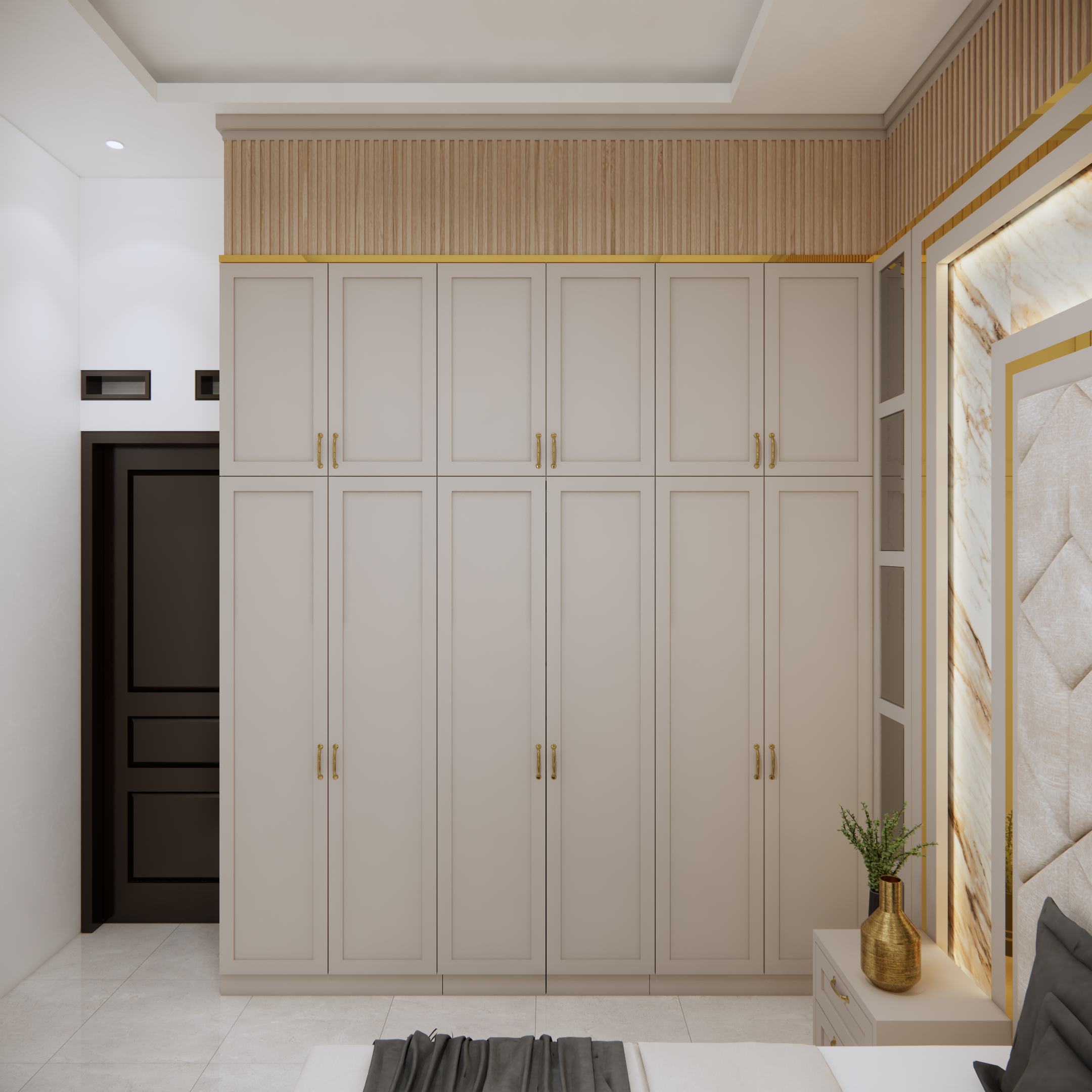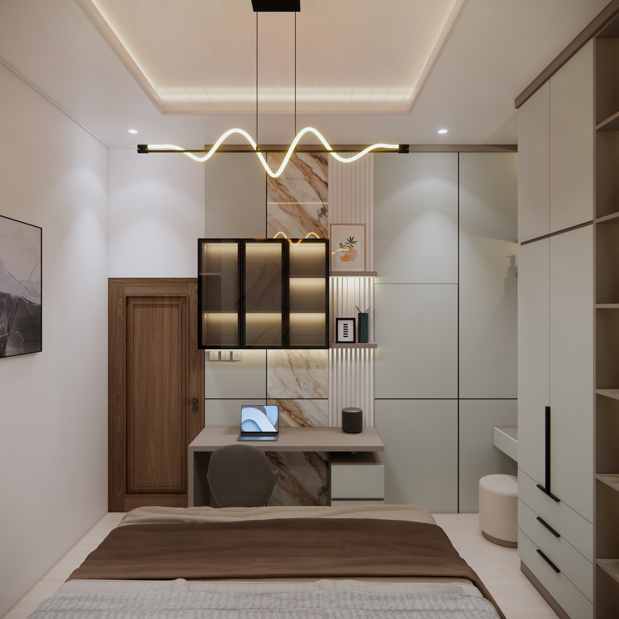 Pemilihan warna dinding biasanya berperan besar dalam menciptakan nuansa kamar. Warna lembut seperti putih, krem, abu muda, atau pastel akan memberikan kesan luas, bersih, dan menenangkan. Sementara itu, warna yang lebih gelap seperti navy atau abu tua bisa menghadirkan suasana elegan dan eksklusif, terutama jika dipadukan dengan pencahayaan hangat.