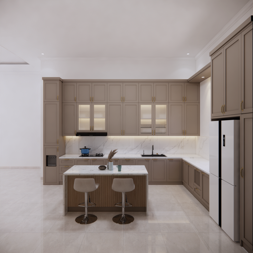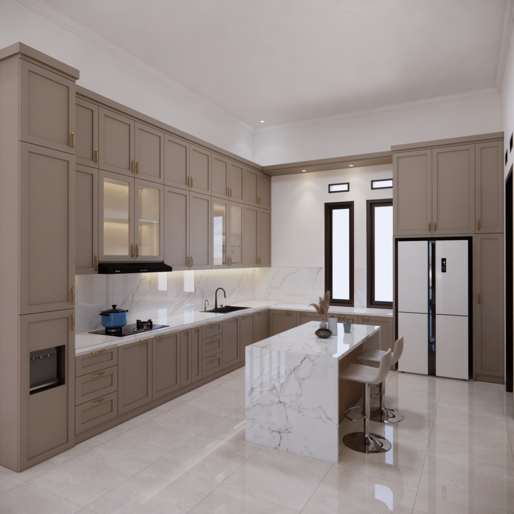Secara keseluruhan, dapur semi klasik adalah pilihan ideal bagi Anda yang menginginkan desain elegan dan berkelas, tanpa meninggalkan efisiensi modern. Kehadirannya mampu memberikan suasana mewah namun tetap hangat, menjadikan dapur sebagai jantung rumah yang memancarkan harmoni dan kenyamanan.