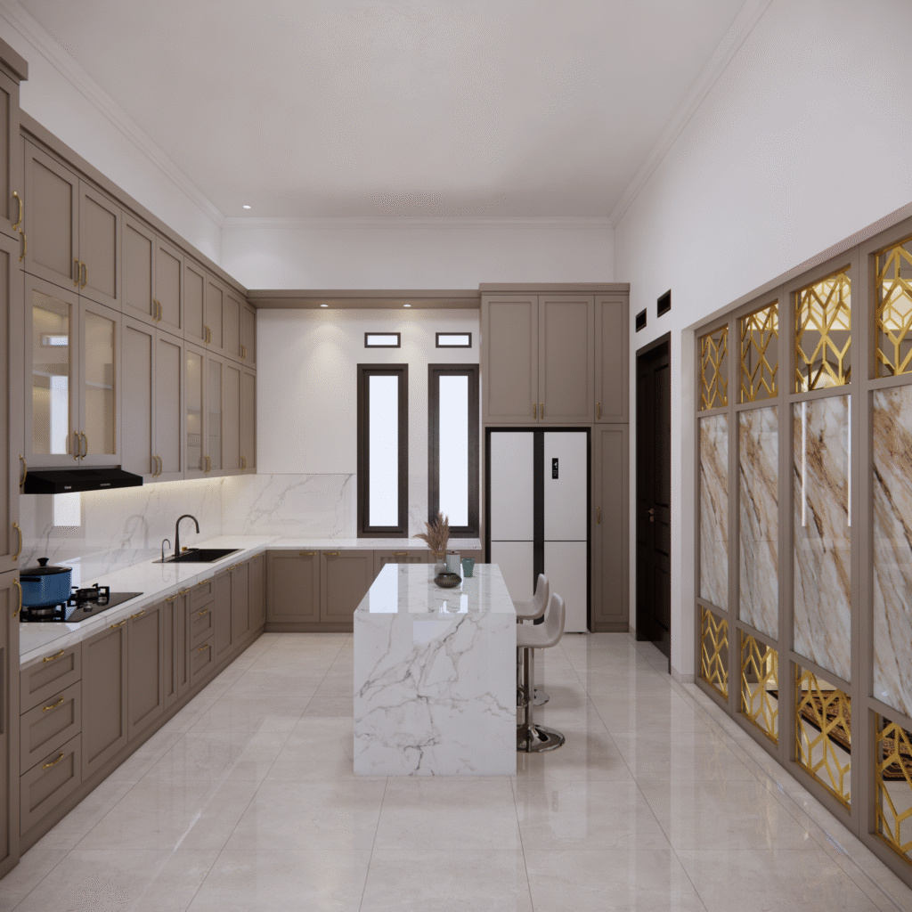 Material alami juga menjadi elemen penting dalam dapur semi klasik. Permukaan meja dapur biasanya menggunakan marmer atau granit dengan pola urat alami yang menawan, sementara lantai dapat dipilih dari kayu solid, parket, atau keramik motif klasik. Semua elemen ini berpadu menghadirkan kesan hangat sekaligus eksklusif.