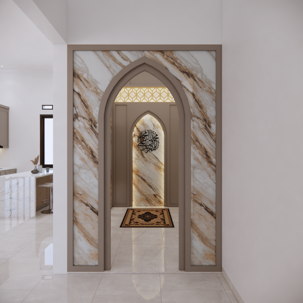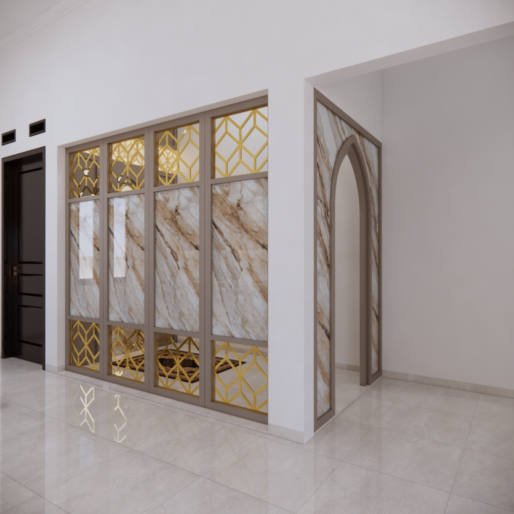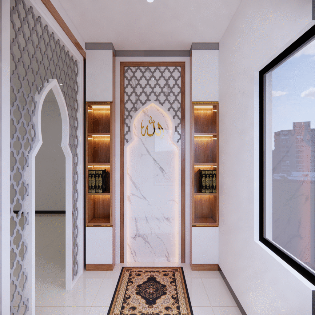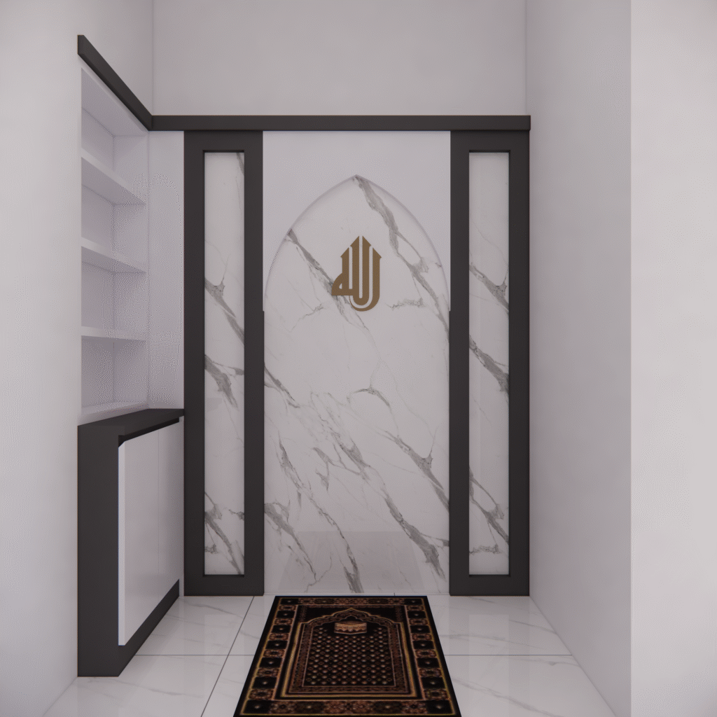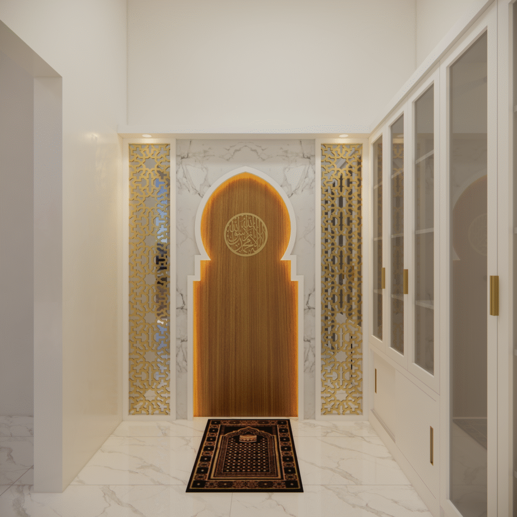 Interior musholla dengan desain mihrab yang menawan ini memancarkan suasana tenang, khusyuk, dan penuh keteduhan. Bagian mihrab ditempatkan di sisi utama ruangan, menjadi pusat perhatian dengan lengkung yang elegan serta dihiasi ornamen islami bernuansa geometris maupun kaligrafi. Warna-warna netral seperti krem, putih gading, dan sentuhan kayu alami mendominasi, menciptakan kesan bersih dan suci, sementara aksen emas atau hijau zamrud pada detail ukiran menambahkan nuansa kemegahan yang lembut.