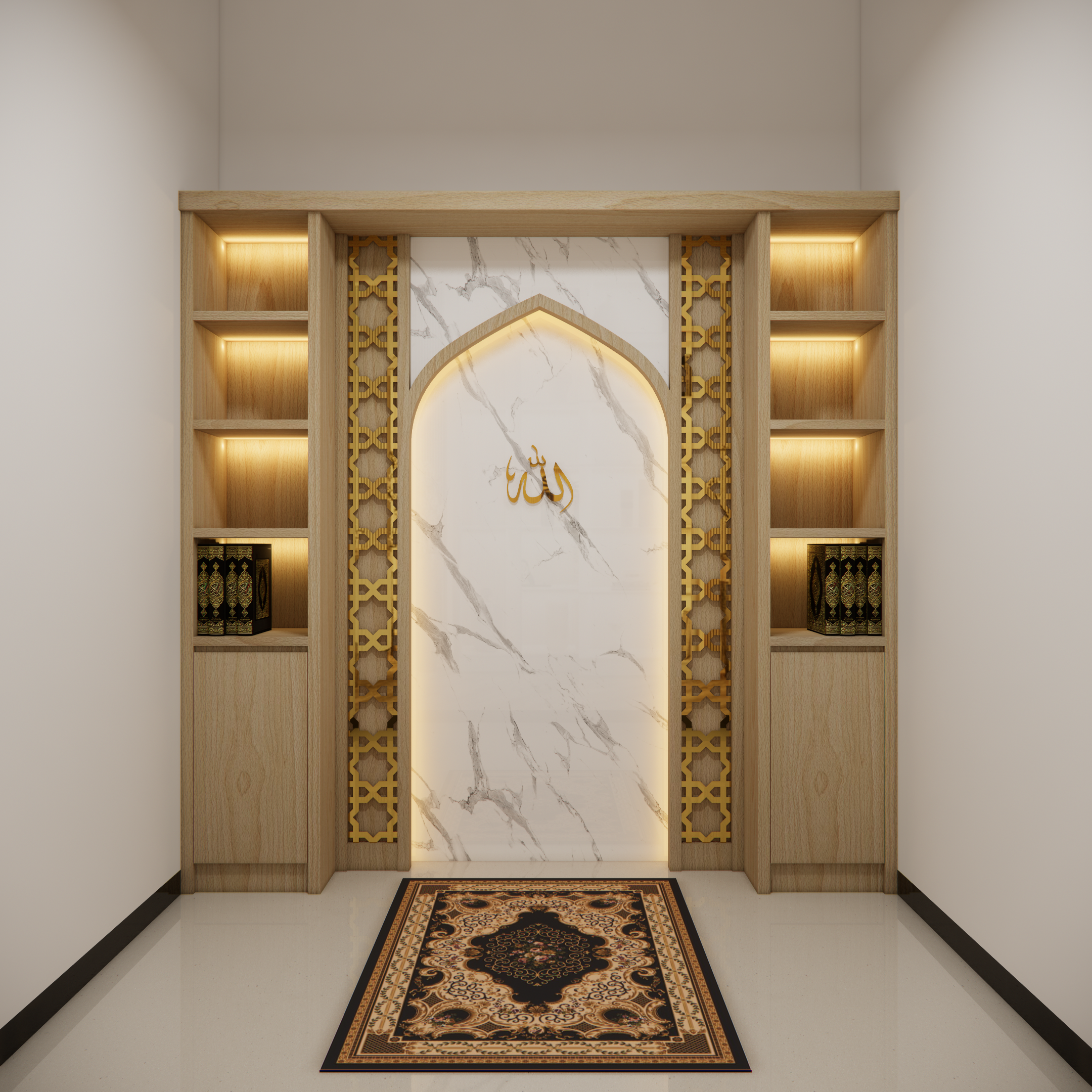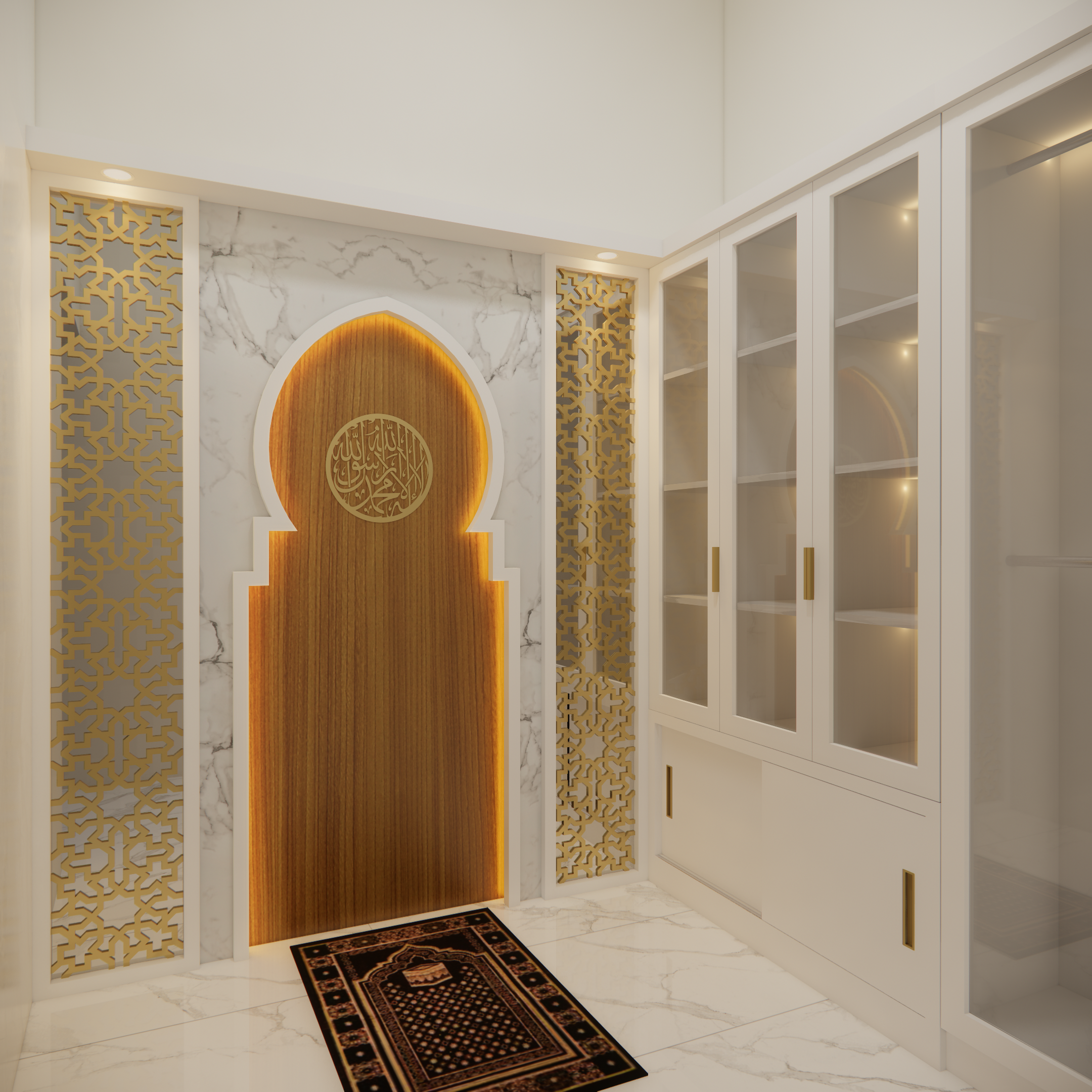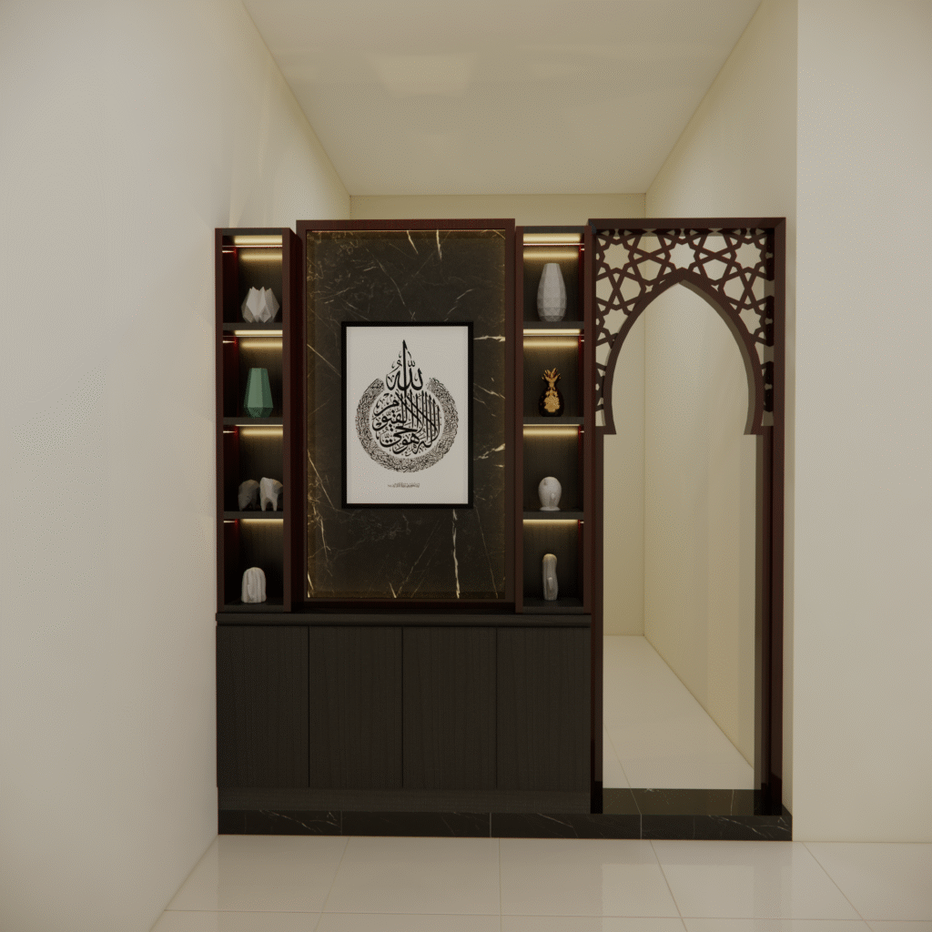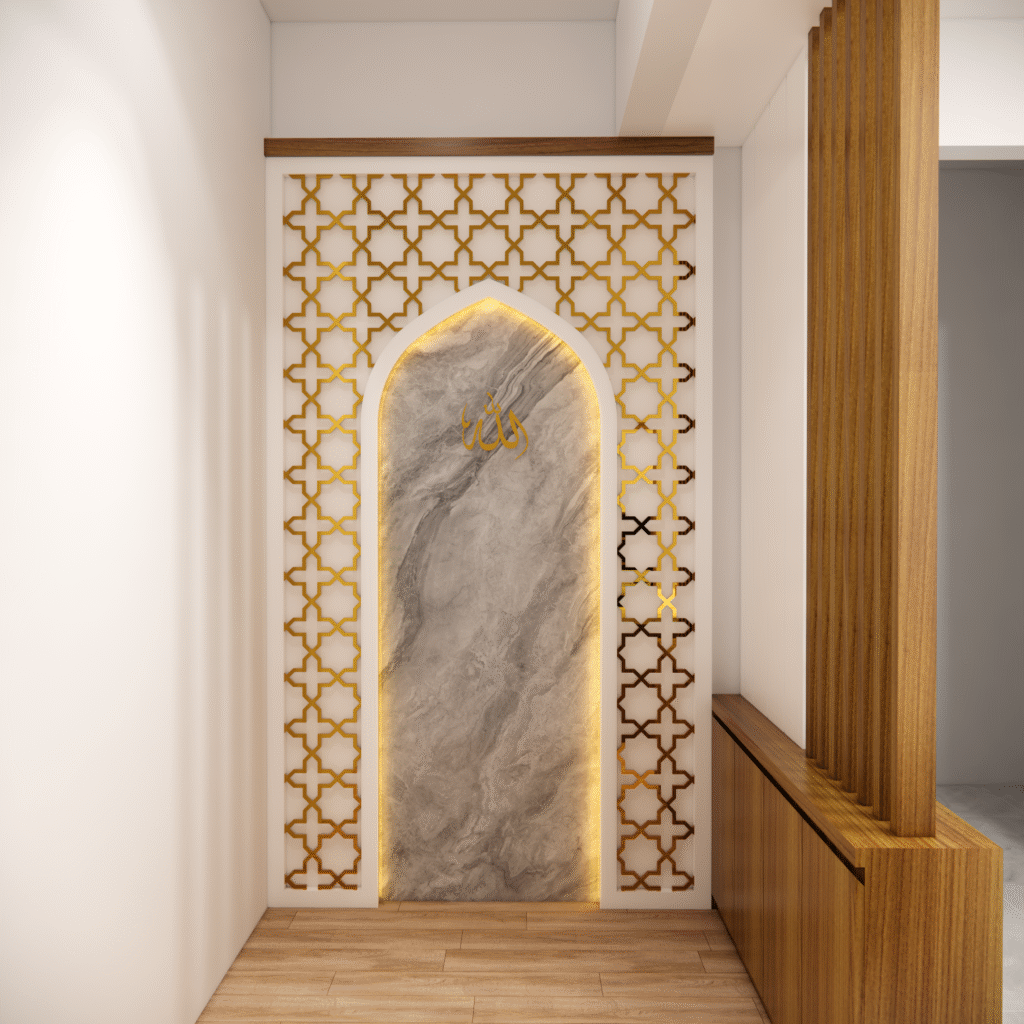Interior musholla dengan desain mihrab yang menawan ini memancarkan suasana tenang, khusyuk, dan penuh keteduhan. Bagian mihrab ditempatkan di sisi utama ruangan, menjadi pusat perhatian dengan lengkung yang elegan serta dihiasi ornamen islami bernuansa geometris maupun kaligrafi. Warna-warna netral seperti krem, putih gading, dan sentuhan kayu alami mendominasi, menciptakan kesan bersih dan suci, sementara aksen emas atau hijau zamrud pada detail ukiran menambahkan nuansa kemegahan yang lembut.