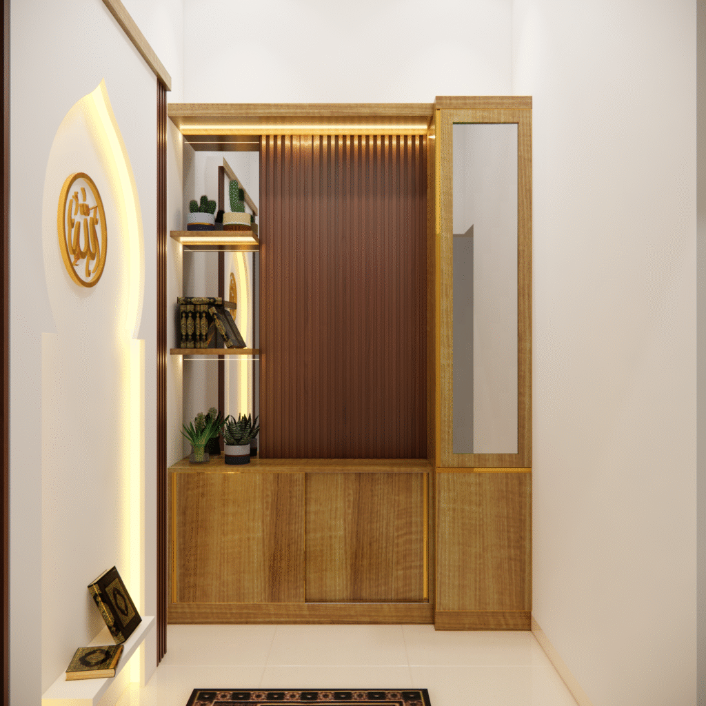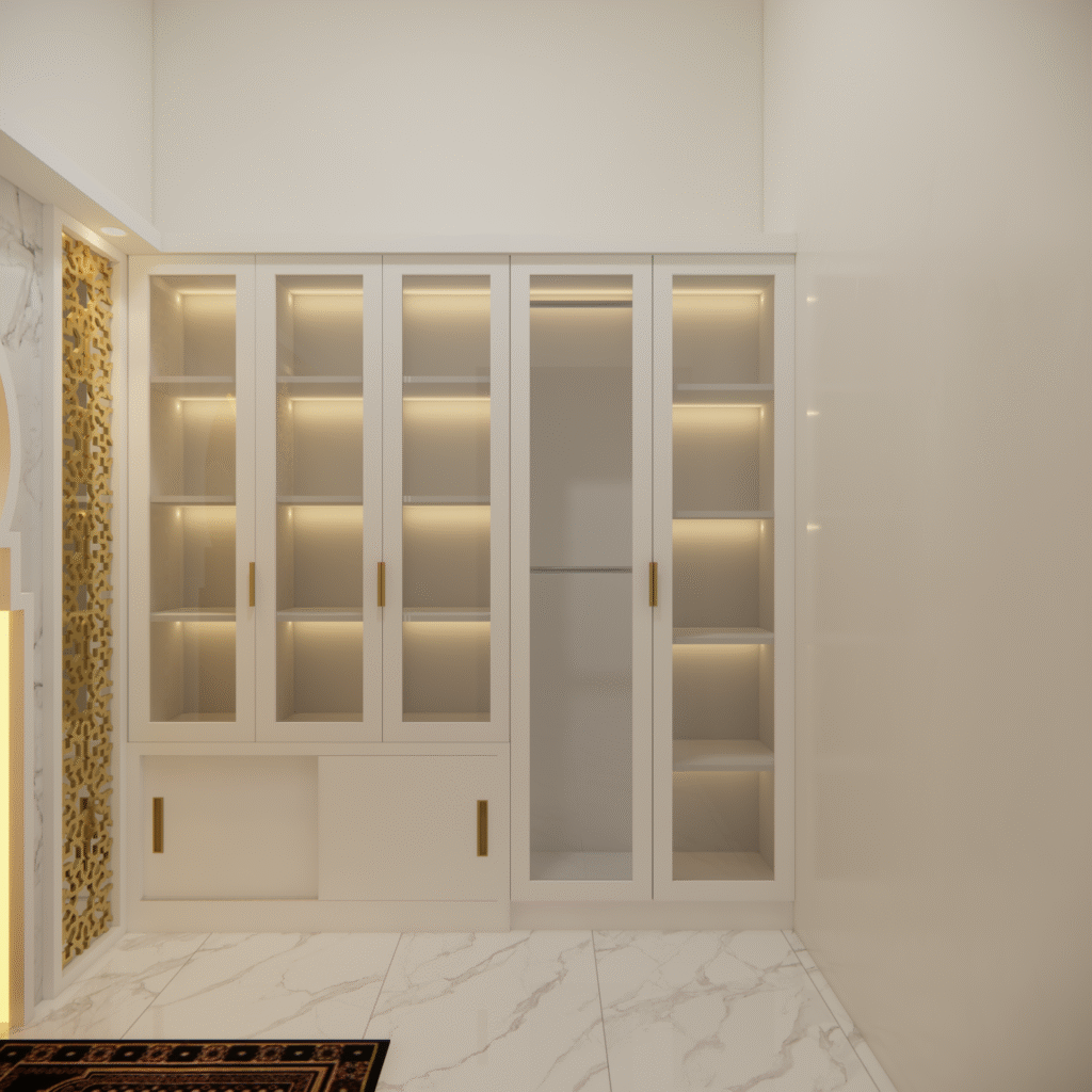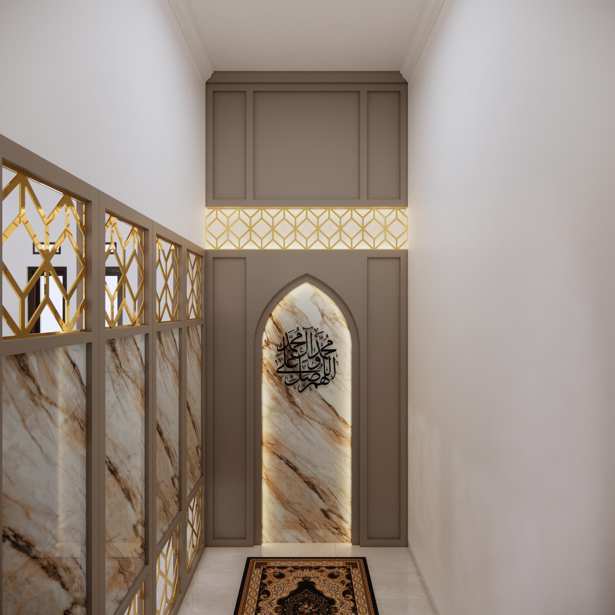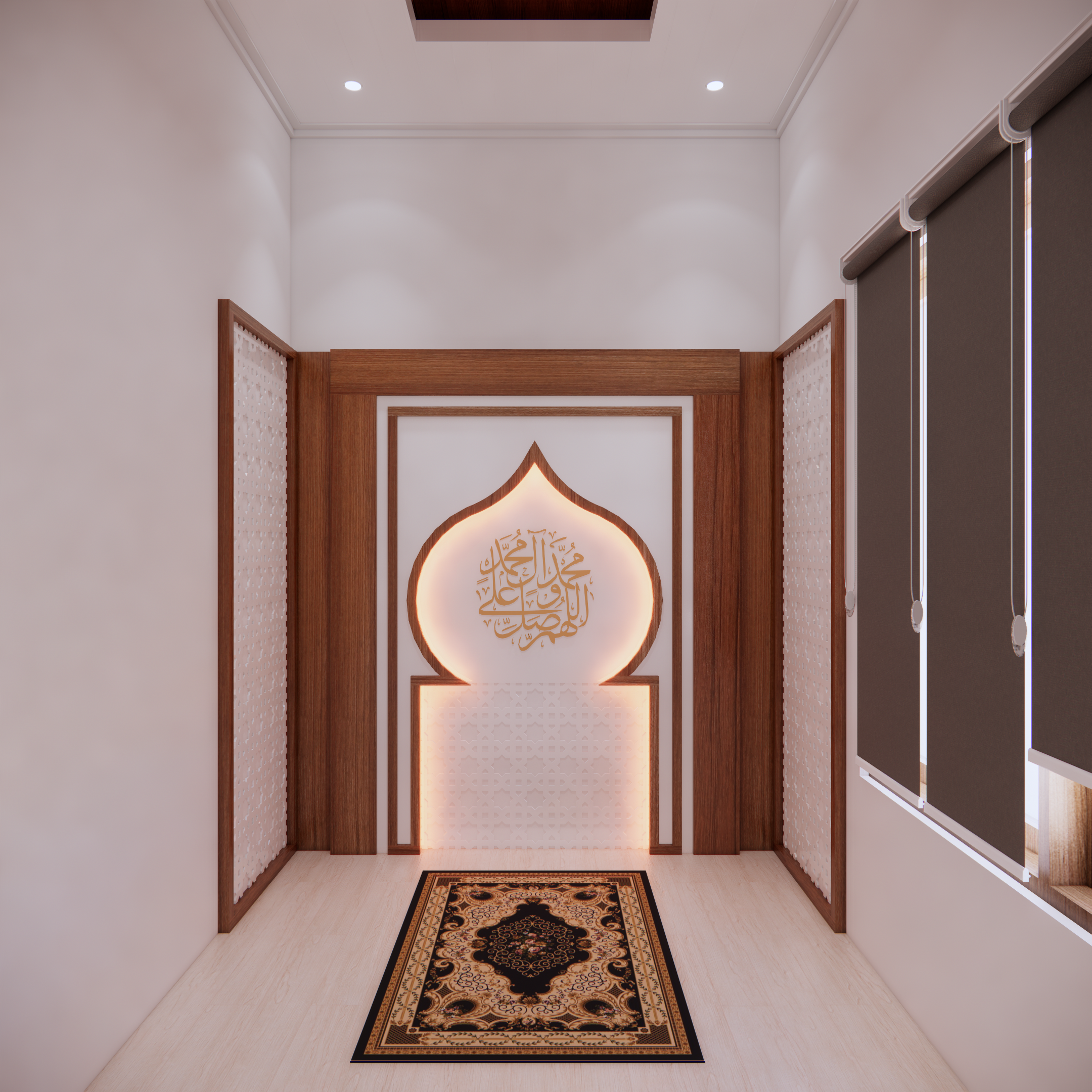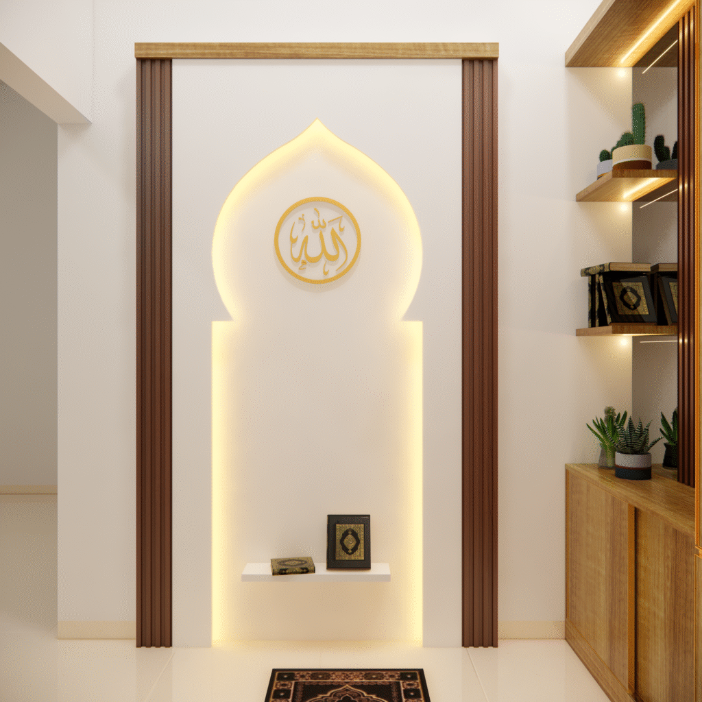 Interior musholla dengan desain mihrab yang menawan ini memancarkan suasana tenang, khusyuk, dan penuh keteduhan. Bagian mihrab ditempatkan di sisi utama ruangan, menjadi pusat perhatian dengan lengkung yang elegan serta dihiasi ornamen islami bernuansa geometris maupun kaligrafi. Warna-warna netral seperti krem, putih gading, dan sentuhan kayu alami mendominasi, menciptakan kesan bersih dan suci, sementara aksen emas atau hijau zamrud pada detail ukiran menambahkan nuansa kemegahan yang lembut.