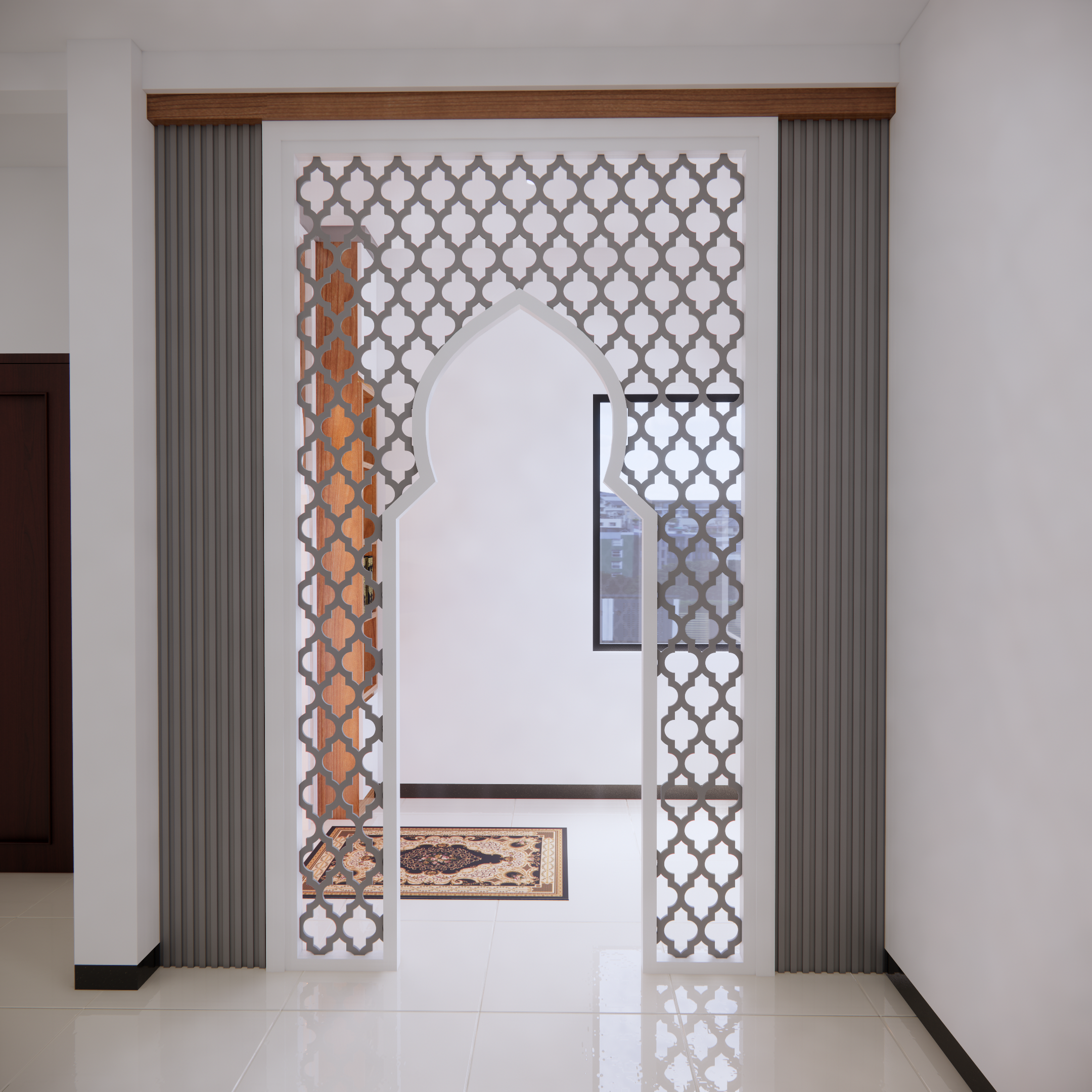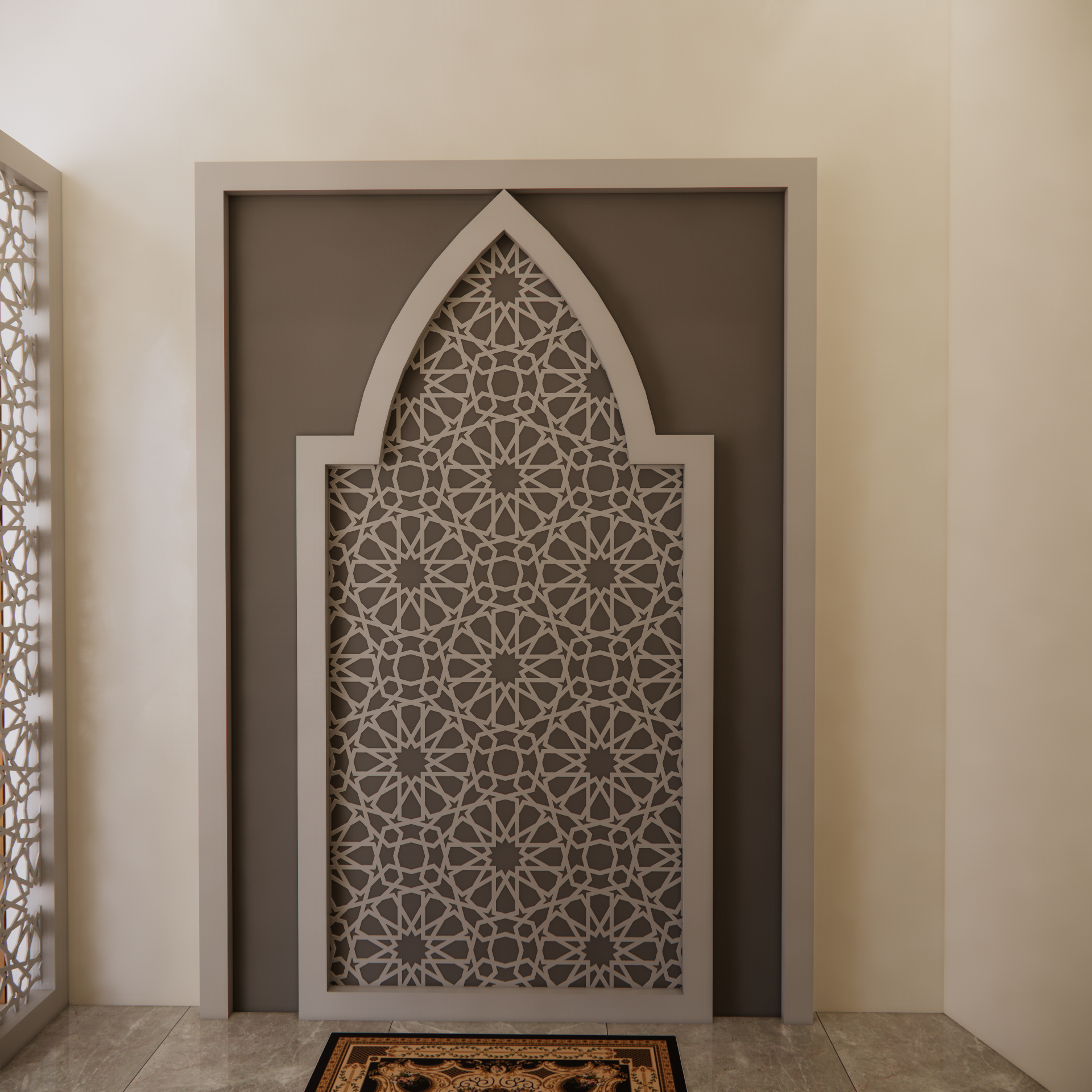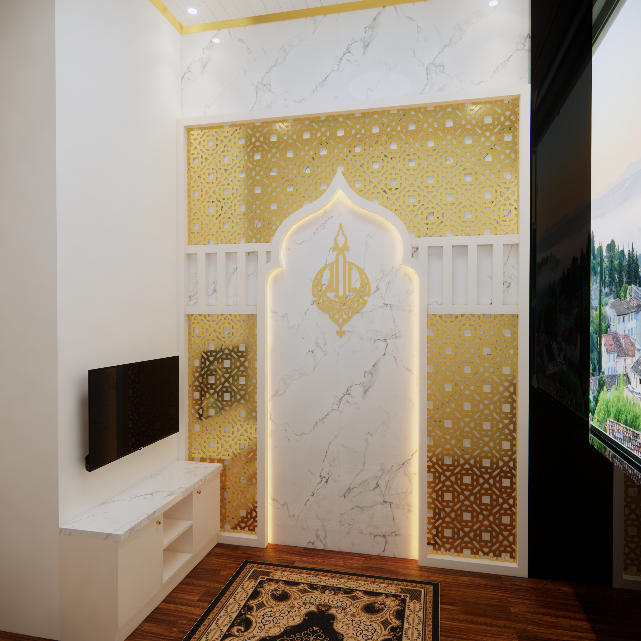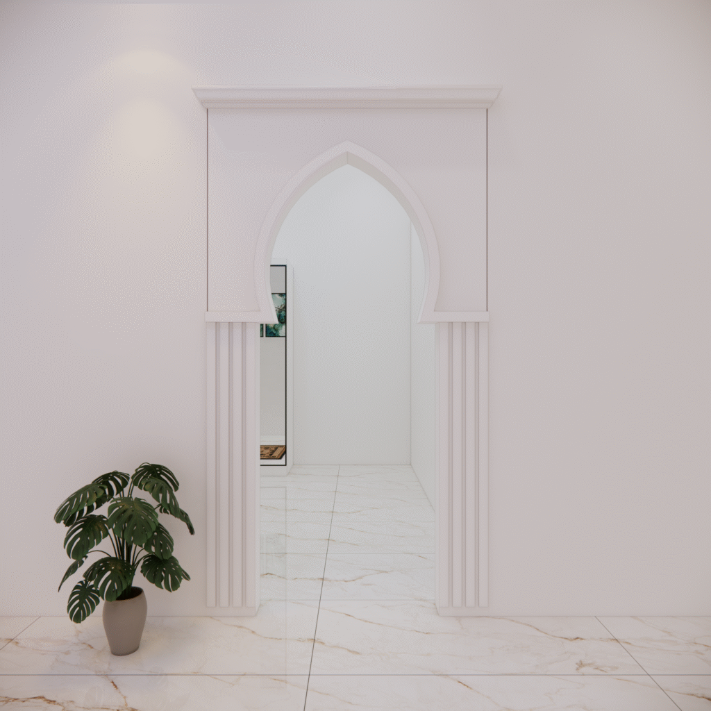 Interior musholla dengan desain mihrab yang menawan ini memancarkan suasana tenang, khusyuk, dan penuh keteduhan. Bagian mihrab ditempatkan di sisi utama ruangan, menjadi pusat perhatian dengan lengkung yang elegan serta dihiasi ornamen islami bernuansa geometris maupun kaligrafi. Warna-warna netral seperti krem, putih gading, dan sentuhan kayu alami mendominasi, menciptakan kesan bersih dan suci, sementara aksen emas atau hijau zamrud pada detail ukiran menambahkan nuansa kemegahan yang lembut.