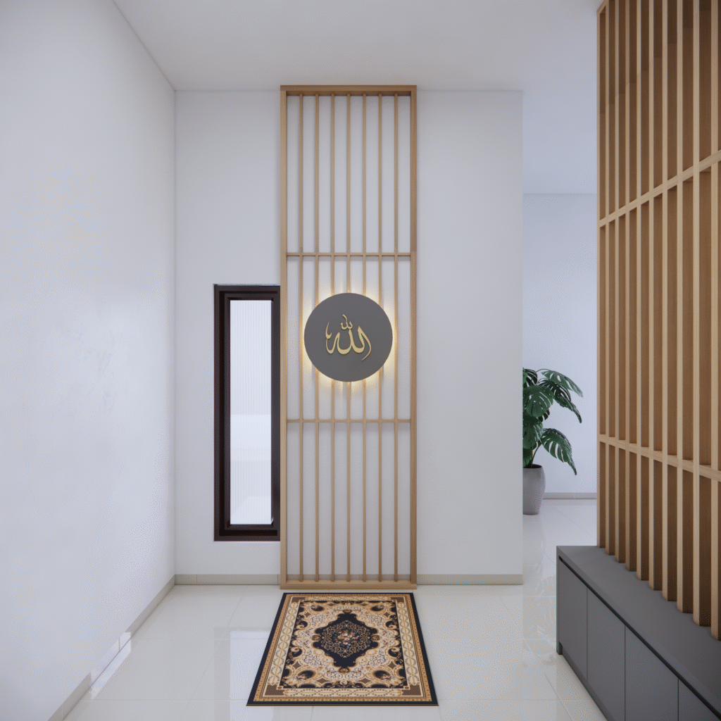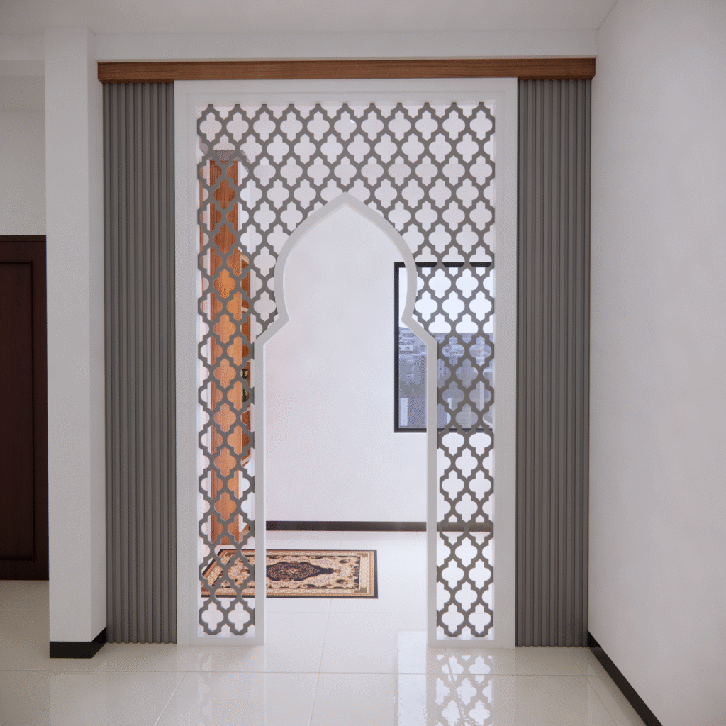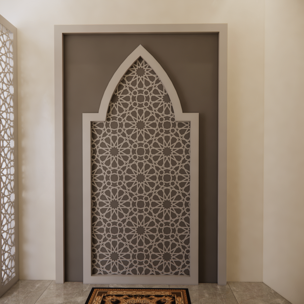 Dinding sekitar mihrab dapat diperkaya dengan ukiran kaligrafi ayat suci Al-Qur’an, seperti Ayat Kursi atau Surah Al-Ikhlas, yang ditempatkan dalam bingkai indah, menjadi pengingat spiritual yang mendalam. Pada bagian atas ruangan, langit-langit berbentuk kubah kecil atau lengkung sederhana sering dipadukan dengan motif bintang dan bulan, menambah kesan sakral dan islami.