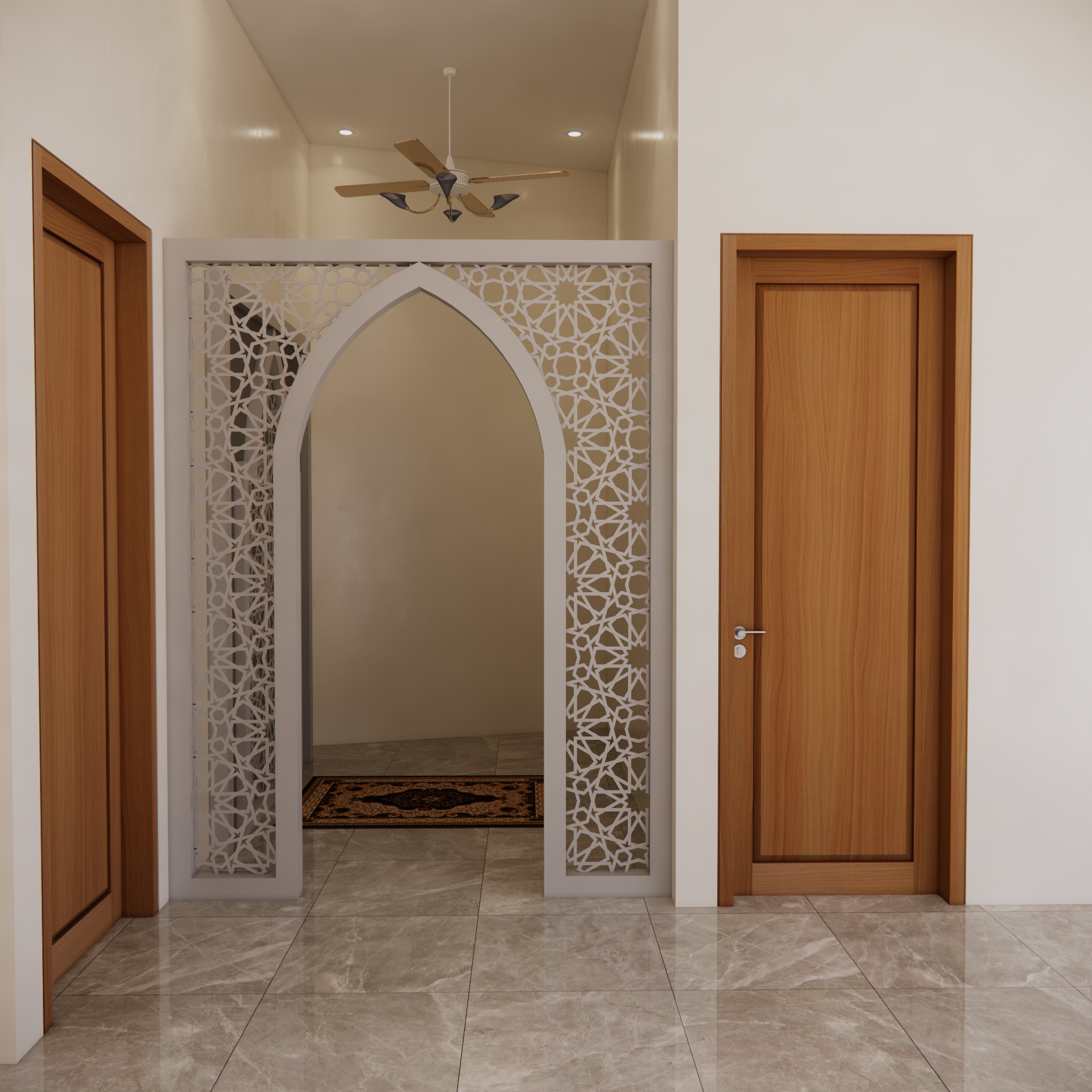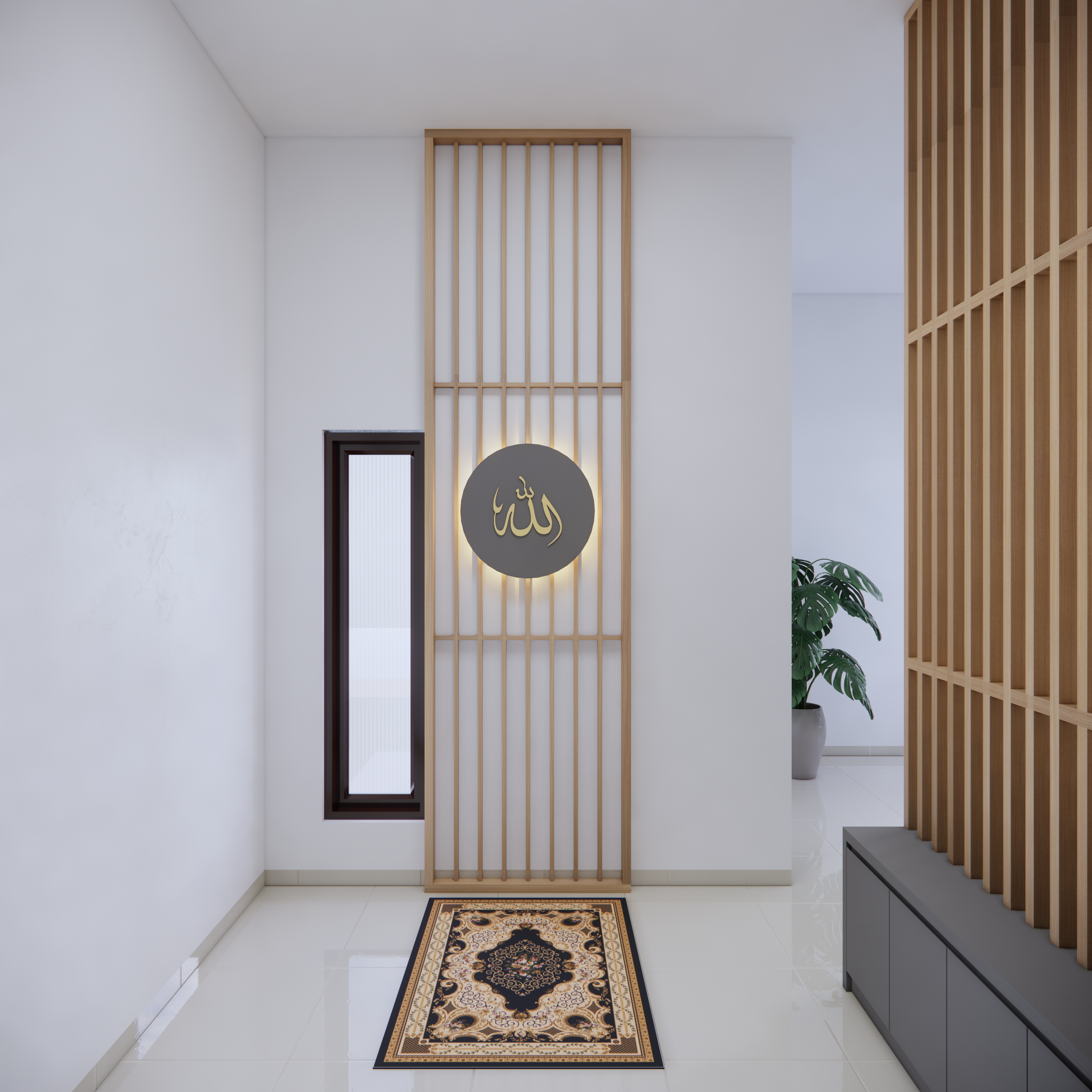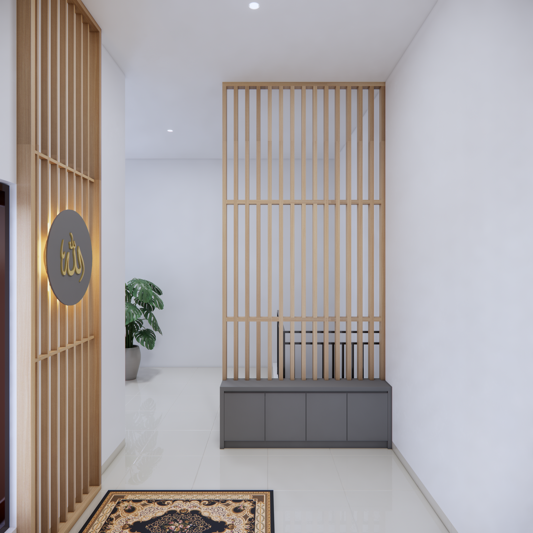 Lantai musholla dilapisi karpet tebal bermotif sederhana yang sejajar rapi dengan arah kiblat, memberikan kenyamanan bagi jamaah saat bersujud. Pencahayaan diatur secara lembut dengan lampu gantung bernuansa islami atau lampu dinding berdesain mashrabiya yang memancarkan cahaya hangat, menghadirkan atmosfer damai terutama saat waktu shalat malam.